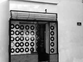 allow Vinyls. (2 turntables). 2 record objects. Motion sensor. street PA. installation in the window of a record shop