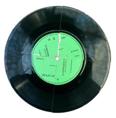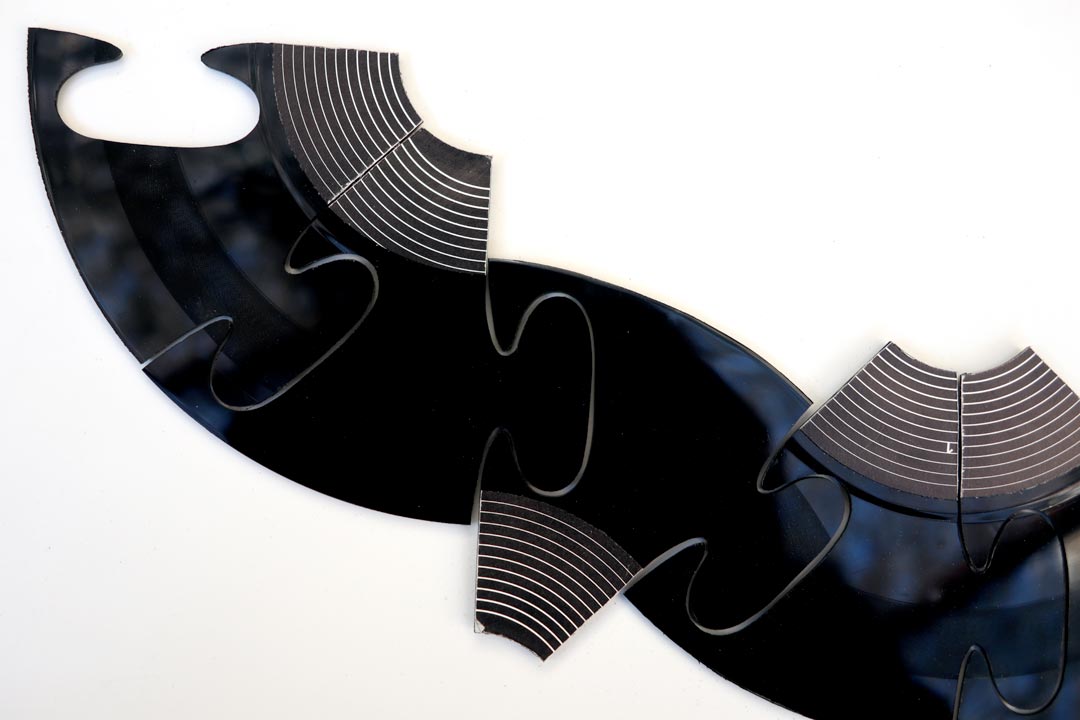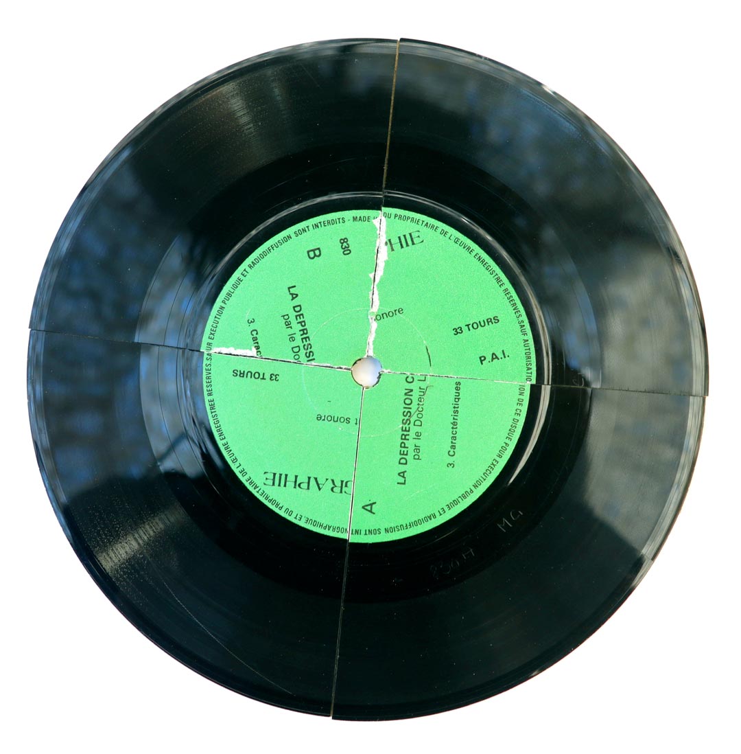 A vinyl E.P. is dissected by a high pressured water-jet. eRikm digs into his material and makes the reading slip, in order to compose a new syncopated variation. The art piece replays the turntable master artist’s beloved processes : boned snatches physically remixed and compiled like an unconscious puzzle.