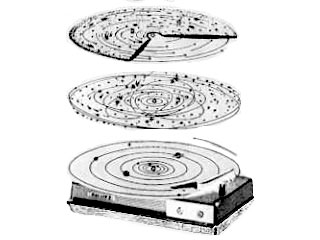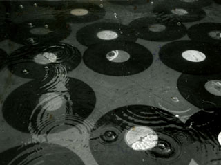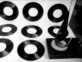 allow Vinyls. (2 turntables). 2 record objects. Motion sensor. street PA. installation in the window of a record shop