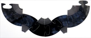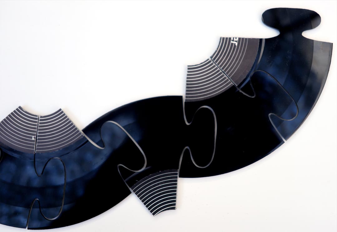 A vinyl E.P. is dissected by a high pressured water-jet. eRikm digs into his material and makes the reading slip, in order to compose a new syncopated variation. The art piece replays the turntable master artist’s beloved processes : boned snatches physically remixed and compiled like an unconscious puzzle.