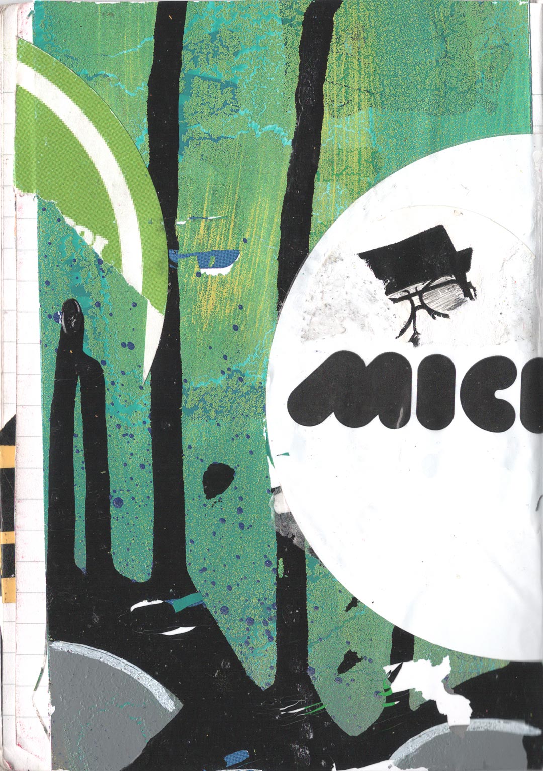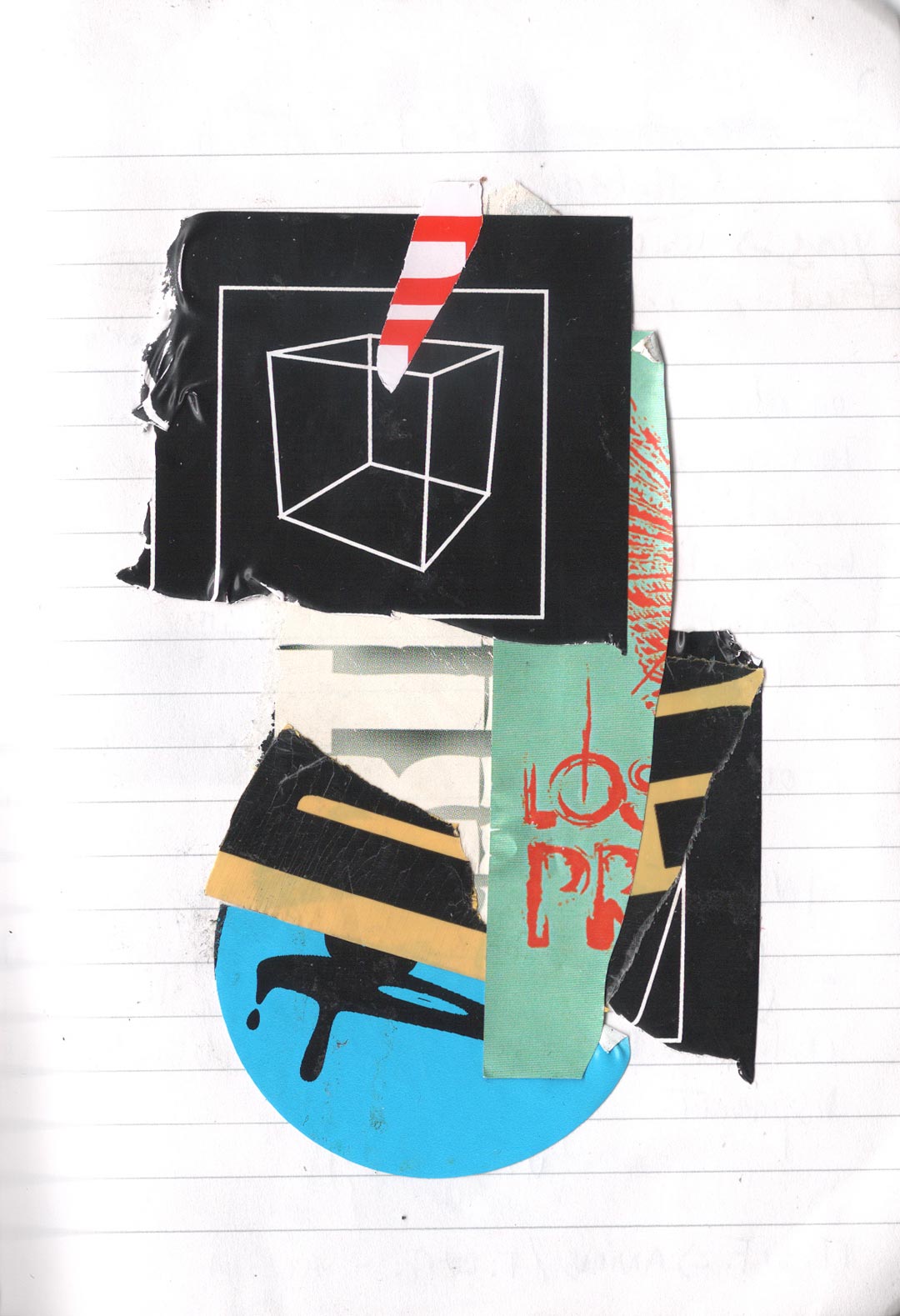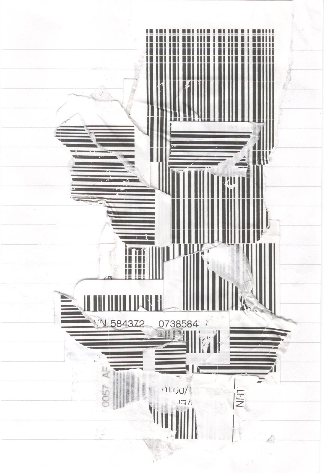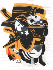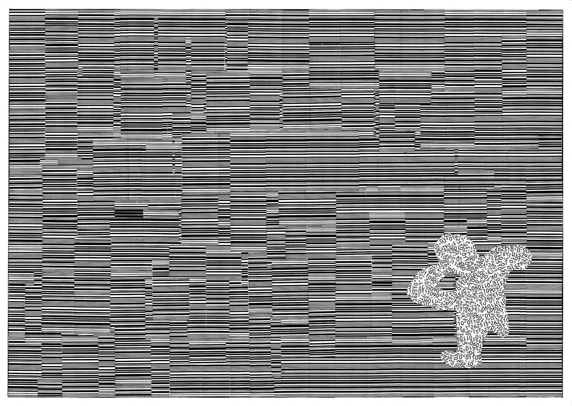 Codé_in is a collage conceived like a transfer support. The device appeals to a self-projection into time and space, notions virtually embodied by the line pattern. On the page, an encoded (on codeine ?) character is inlayed on the surface of an encrypted screen, and cast into the psychic space of a sequential memory. Its unstable posture and fixed position convey this idea of displacement and of a quest for anchorage, revealing the artist’s characteristic nomadism.
