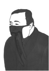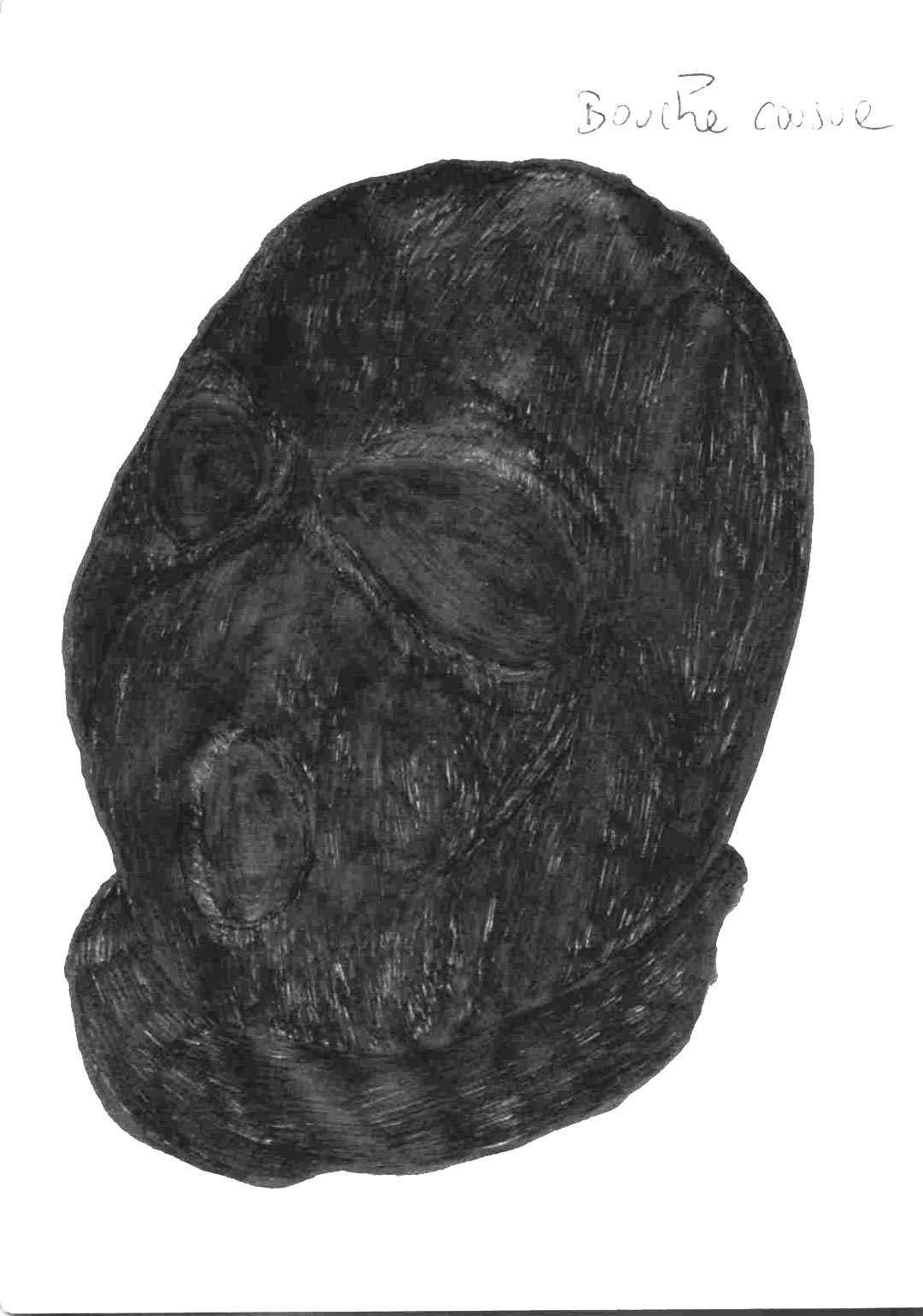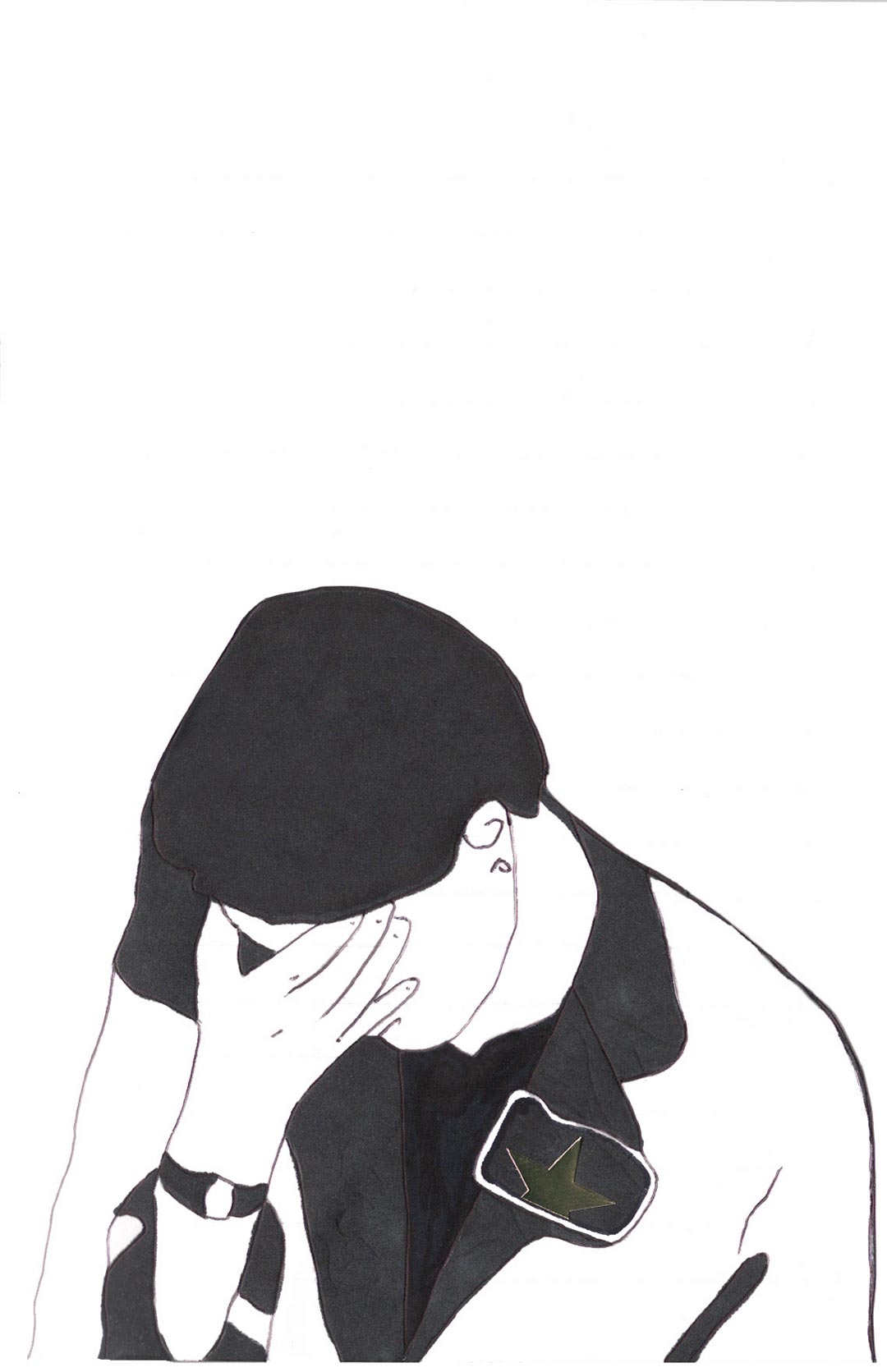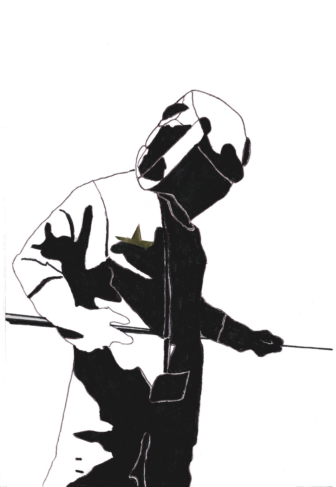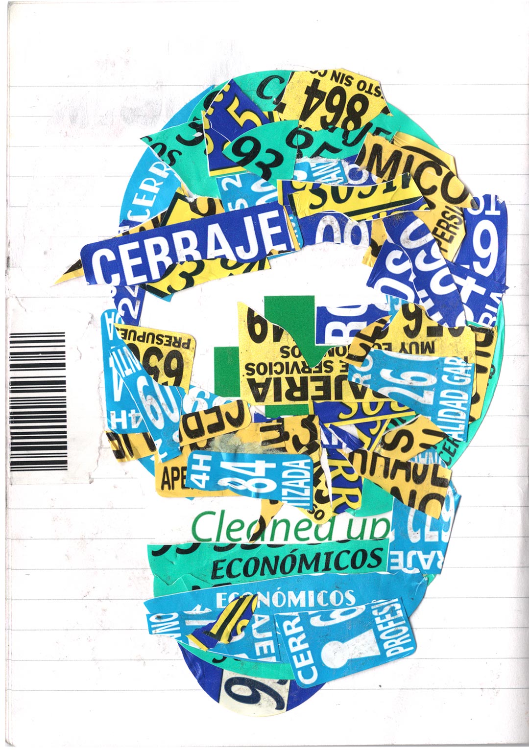 Codé_in is a collage conceived like a transfer support. The device appeals to a self-projection into time and space, notions virtually embodied by the line pattern. On the page, an encoded (on codeine ?) character is inlayed on the surface of an encrypted screen, and cast into the psychic space of a sequential memory. Its unstable posture and fixed position convey this idea of displacement and of a quest for anchorage, revealing the artist’s characteristic nomadism.