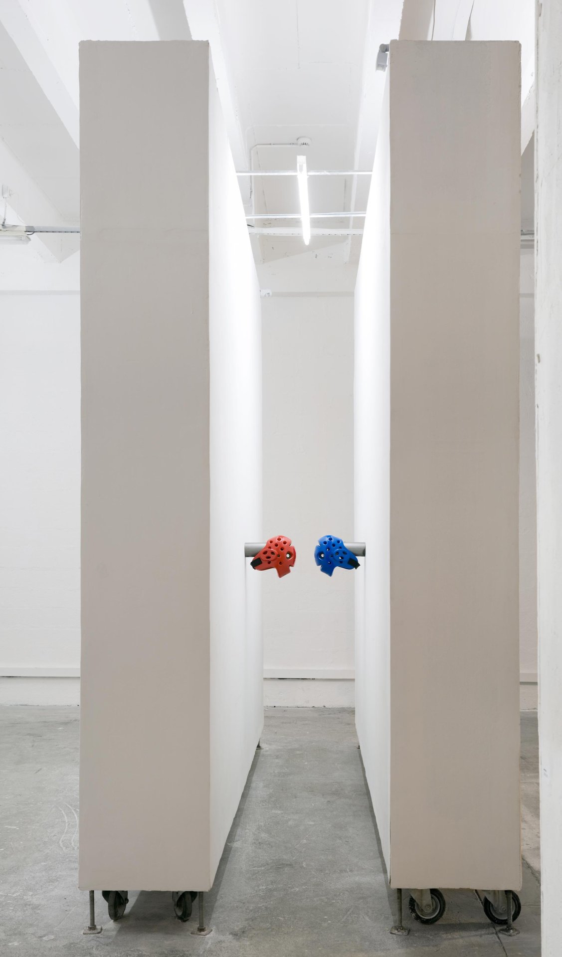 The device invites us to enter a fracture of the repressive system, constricted in between two isolating walls, in between two bowed heads, in between two tonsils : encephalon nucleus keeping signs of our fears.