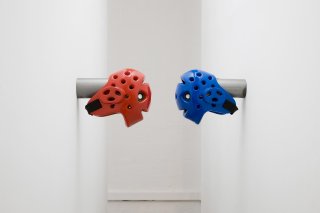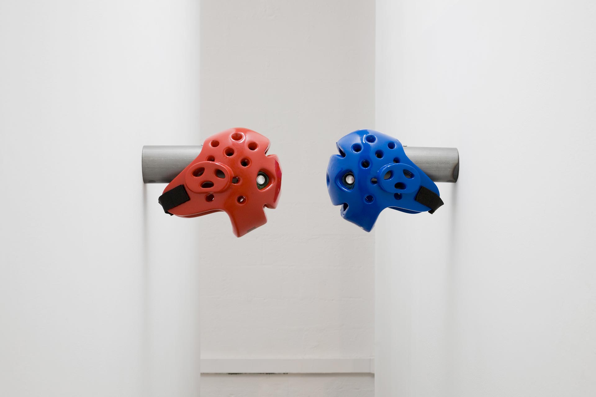 Inserted into fighting helmets, eye sockets connected to electronic sensors broadcast a high pressure acoustic frequency. The system is inspired by a new type of despotic weapon conceived to maintain order :