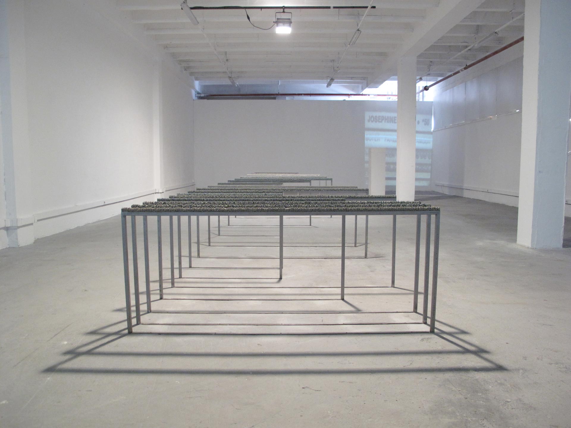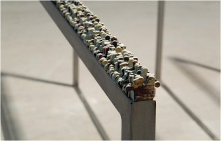 Disincarnation of an alleged original “aura” of the “master-work” in the industrial serialisation of its artefacts. Here, puzzles of master pieces are broken up to their very pieces, and lined up according to the reading order and reset on empty metallic frames.