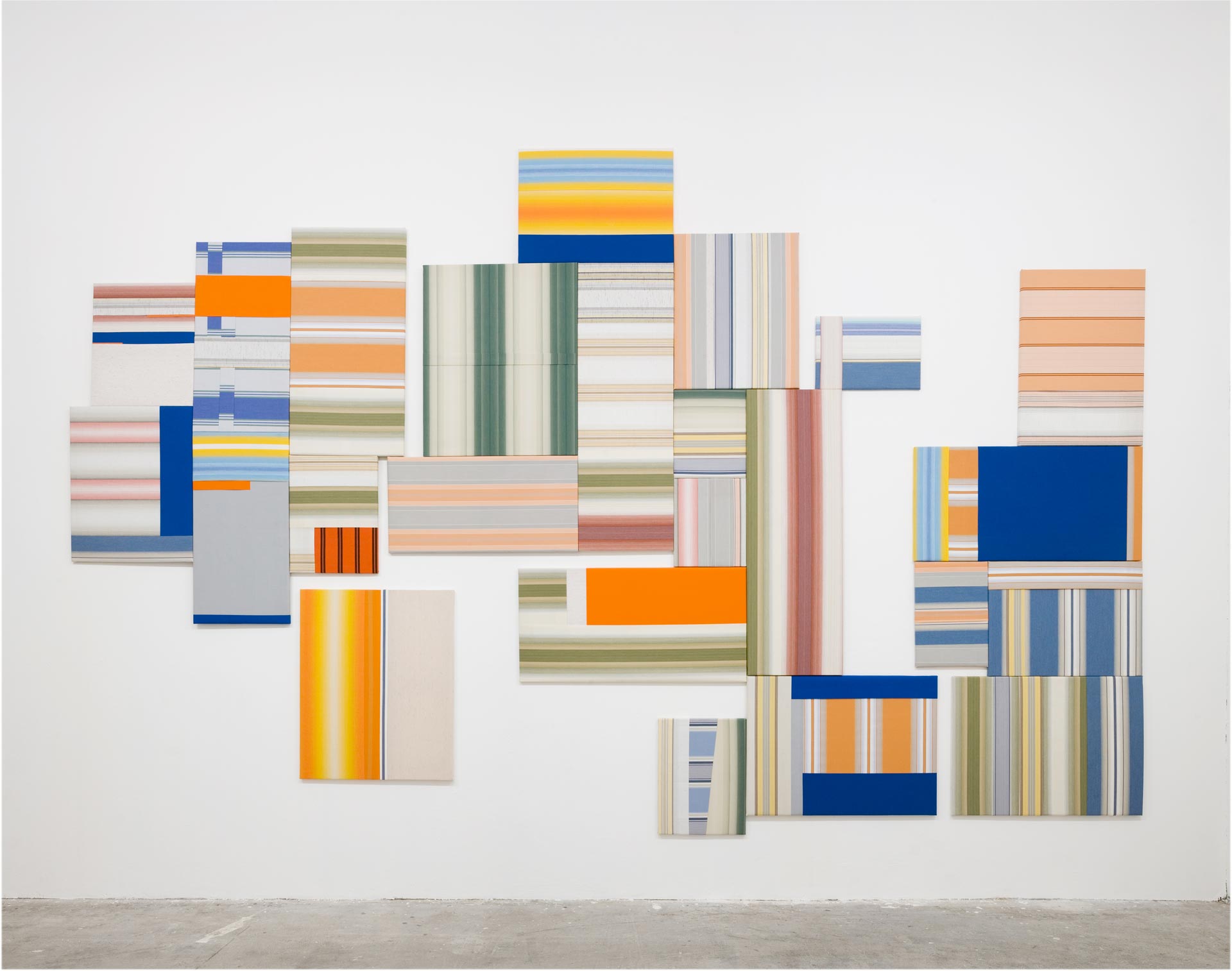 Canvas, frame, industrial colours and formal abstractions refer to a certain history of art which surfaces, as if medium and materials have been re-digested. Wefts, streaks and stretched pixels replay the graphic resolutions set on analogical editing tables/ mixing desk.