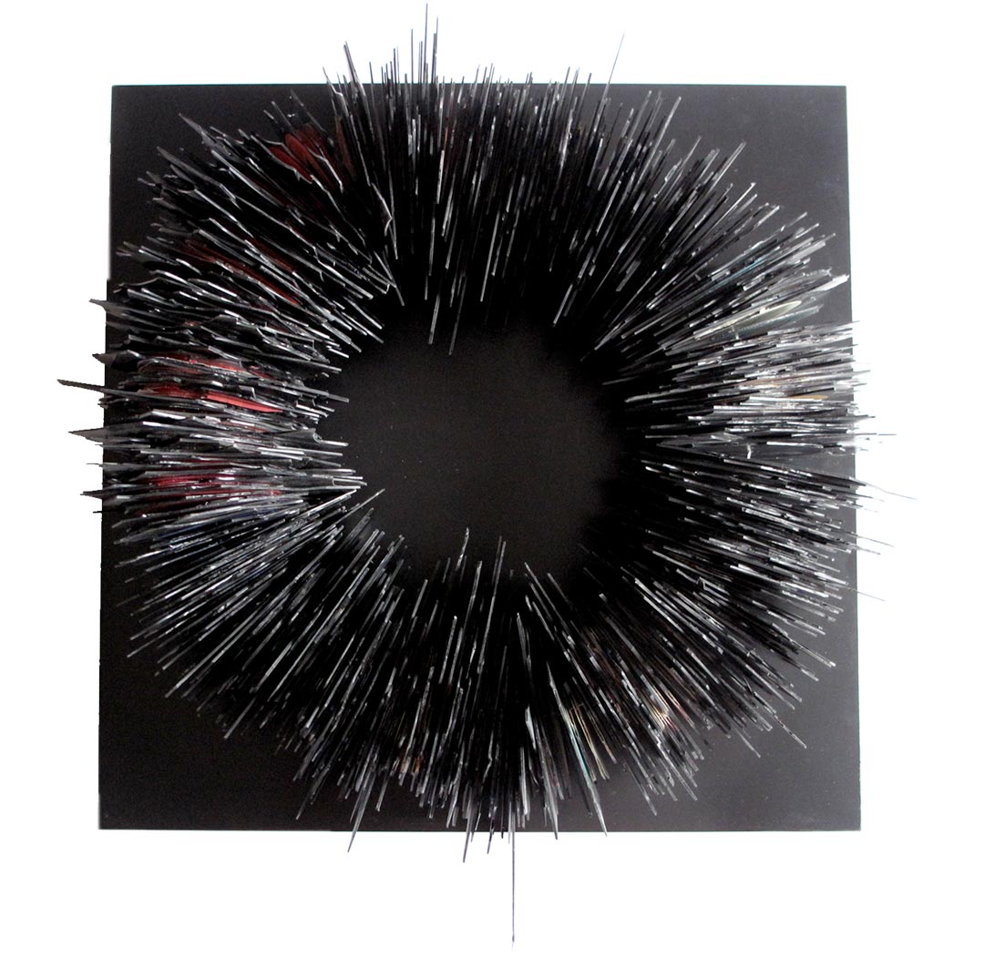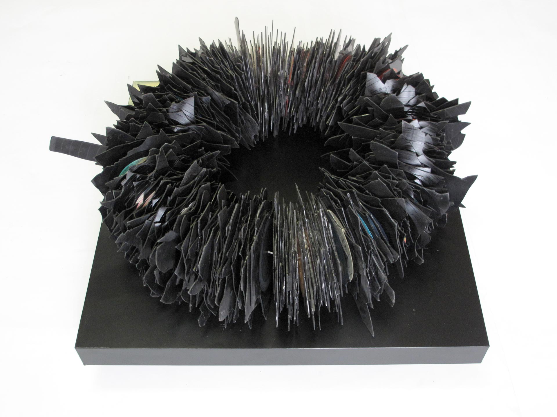 Like an altar set for the sacrifice of “memory”, the piece plays with the object’s physical and symbolic properties : the vinyl, recording medium of a language both universal and specific, fetishistic icon of a “Barclay” generation, is also this relic from a time passed onto the scrap heap, the waste from mass production.