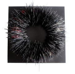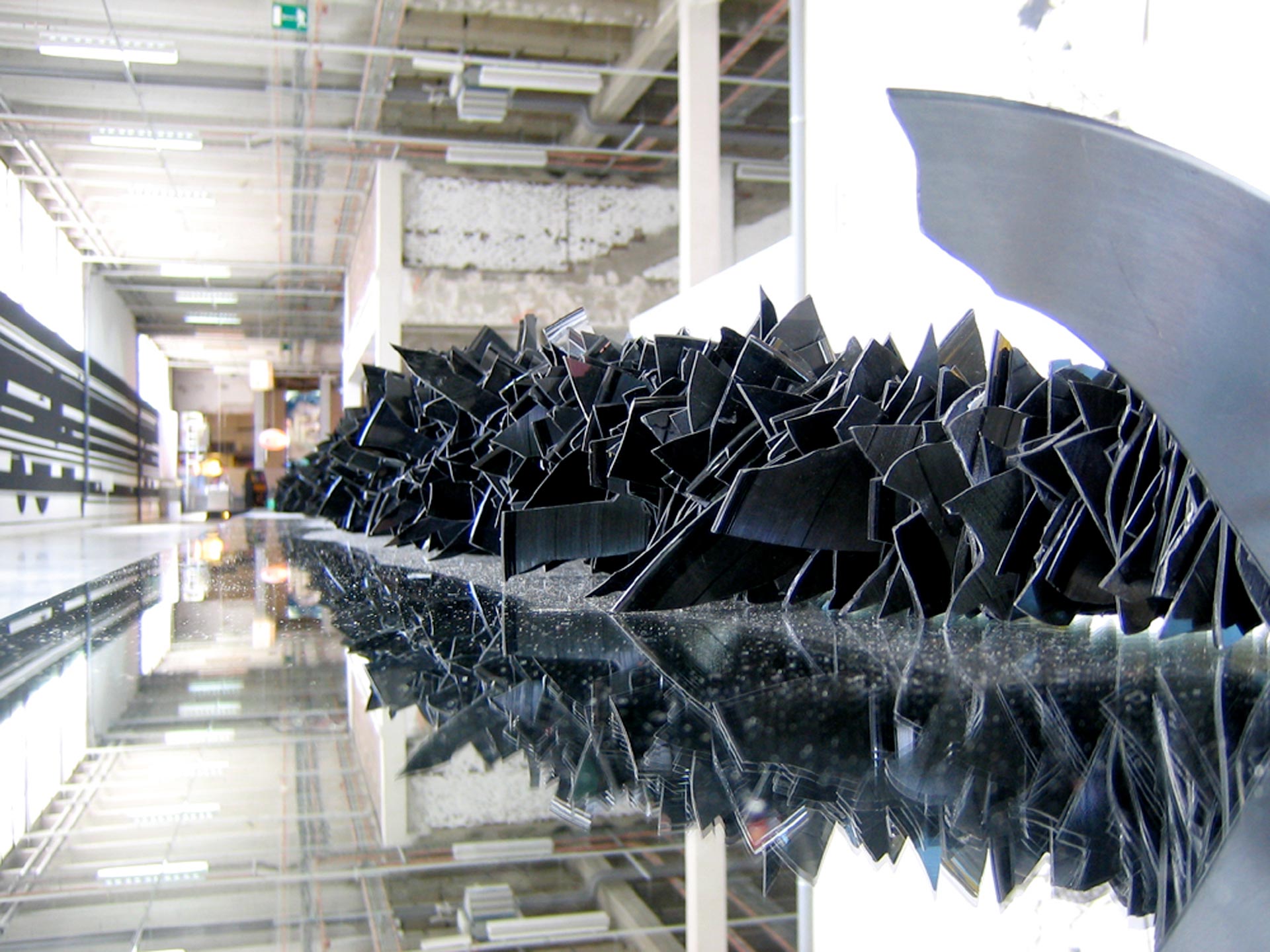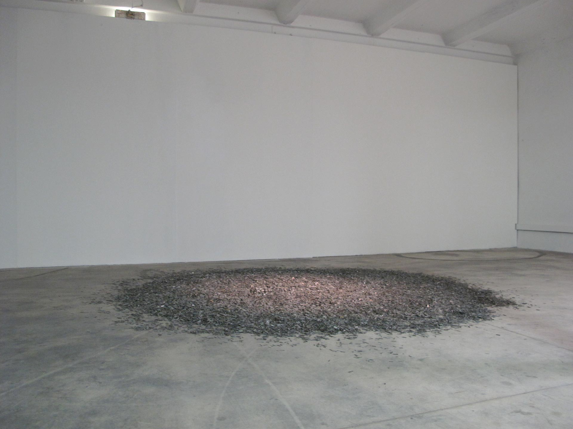 Broken disks, stuck fragments, fractions doubled by a mirror, Staccato scans the space with a sound mass of dull rumbles. 888 vinyls for string instruments : it is the idea of a closed loop, blowing up into atoms remixed around a tight cable, reflecting the trajectory of a silent graphic wave.