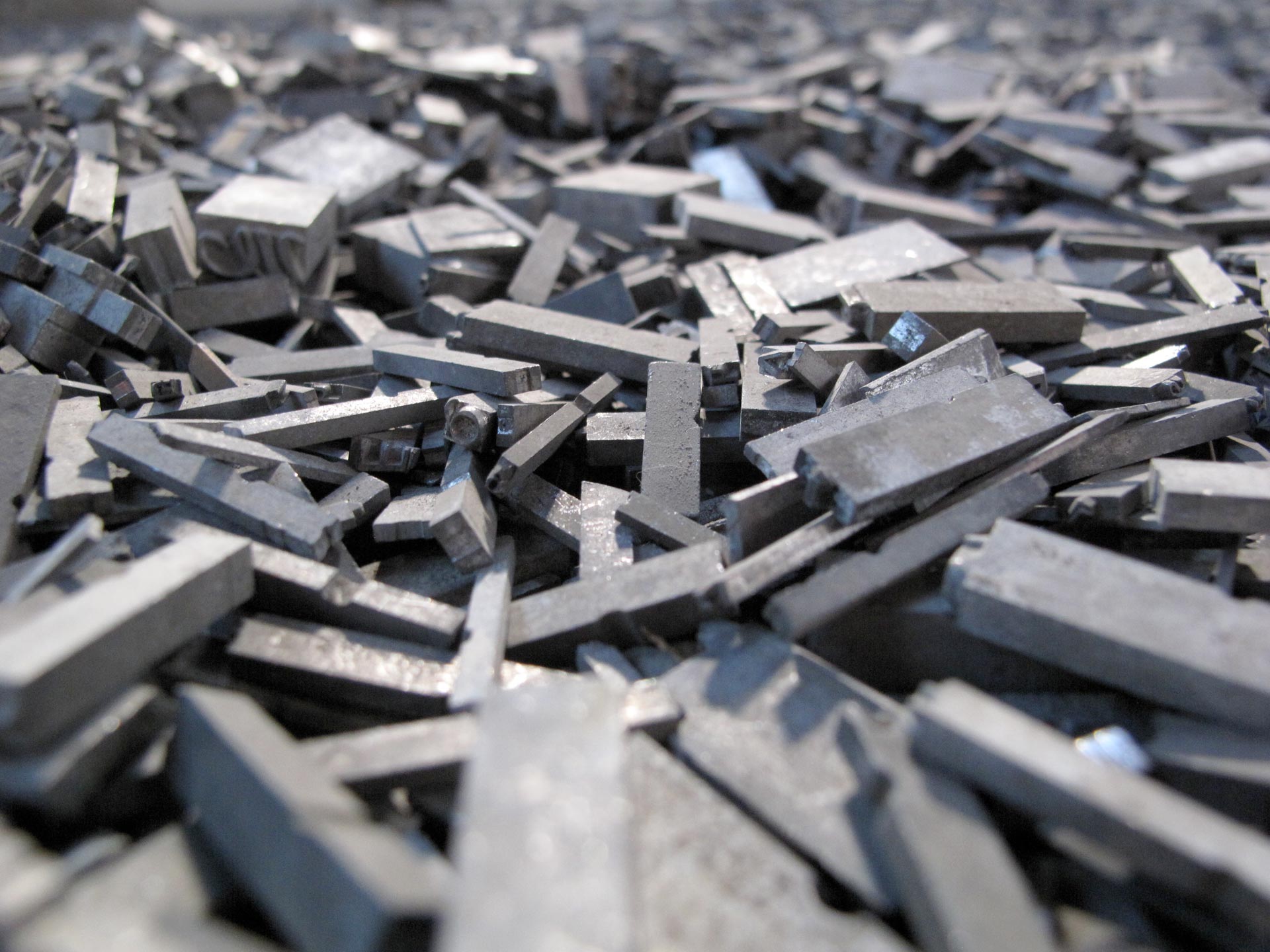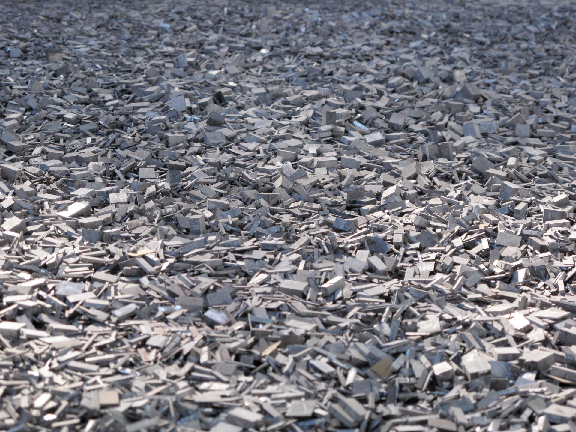 Small typographic lead strips are strewn over the floor. Dust from dismantled words forms a chaotic mass into which the language is broken up.