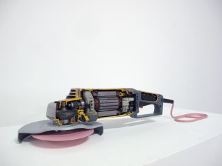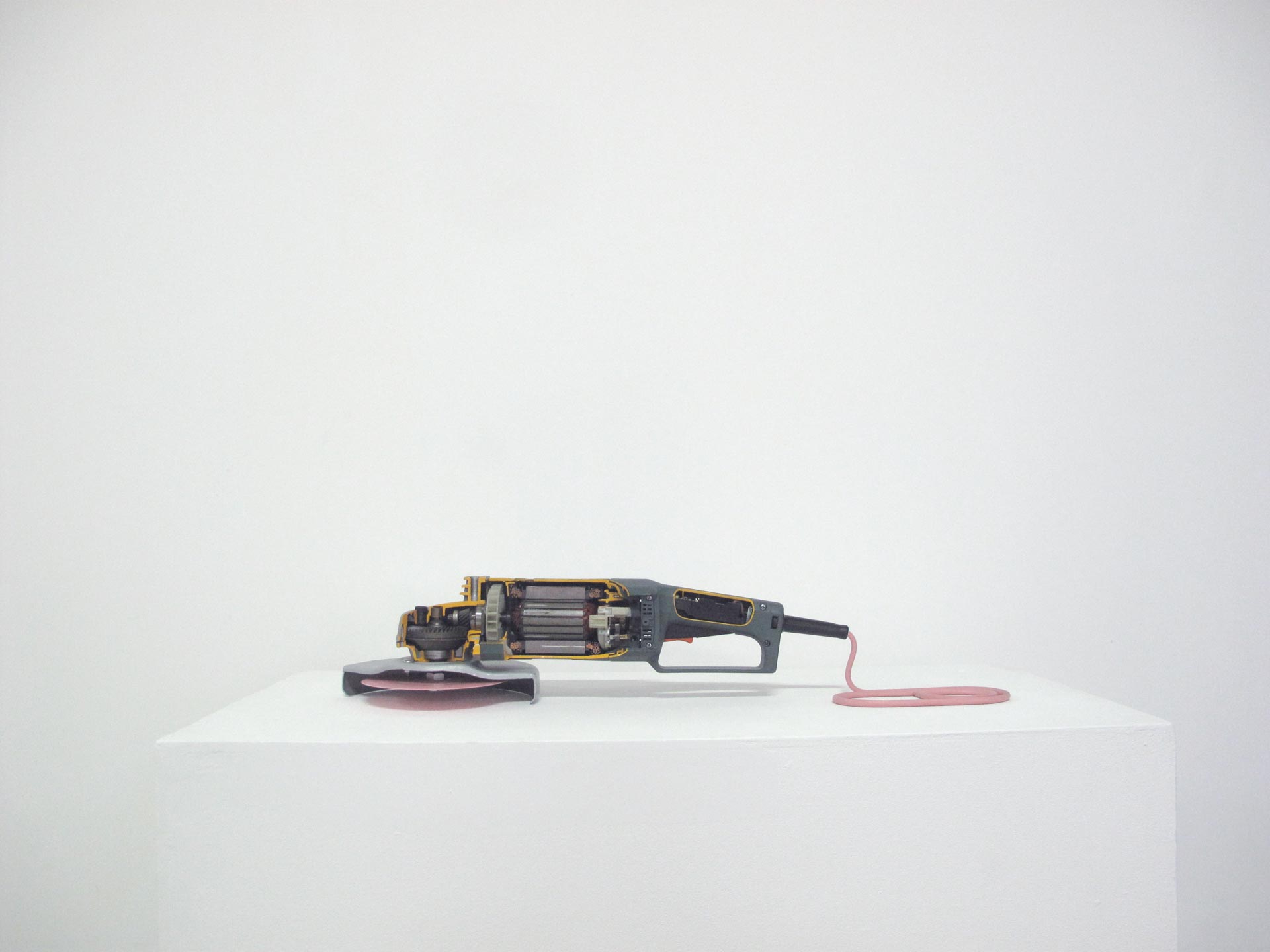 The electric angle grinder is autopsied, and its steel instrument replaced by a coloured vinyl in a kitsch way.