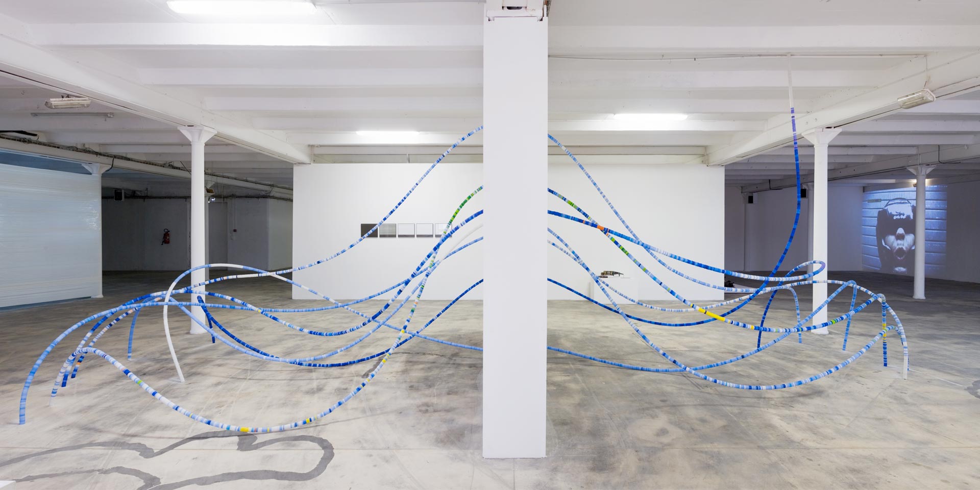 Composed like a sample, the art piece draws rhythmic curves leaking into the building. The installation links the infinitely small to the infinitely large, plays with the tensions between waves and particles, and revisits physics : DNA branches or string theory.